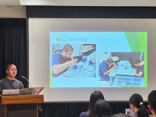 インターンシップ終了後には、みらせんジュニア3教室合同でインターンシップ報告会を開催しました。インターンシップ参加者たちは、他の利用者や家族、支援者、企業が見守る中、自ら作成したパワーポイントを示しながらインターンシップでの取り組みや作業で気を付けた点、仕事を通じてわかった自分の課題などを発表し、受け入れてくださった企業の方々への感謝の気持ちを伝えました。「もっと自分のできることを増やしていきたい」「今回の経験を活かして、みんなを引っ張っていくようなお手本の人になりたい」などと、決意を新たにする利用者の姿もありました。