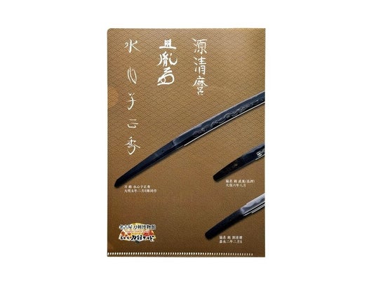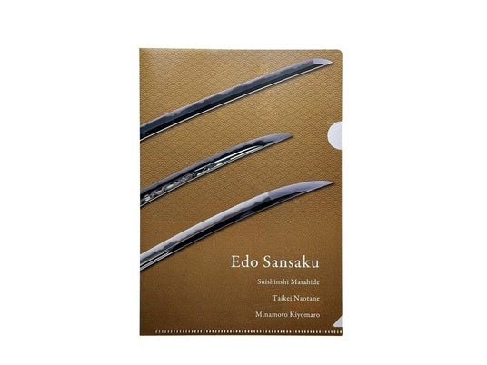 江戸三作の刀を表裏にわたってダイナミックにプリントしたA5クリアファイル。刀朱印も収まるサイズで、小さな紙もの類を持ち運ぶのに便利。裏面にはそれぞれの刀工の銘をあしらっており、江戸三作らしさを取り入れつつも、さりげなく日常使いしやすいデザインです。