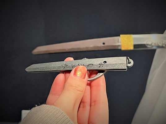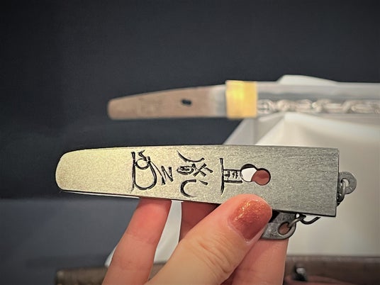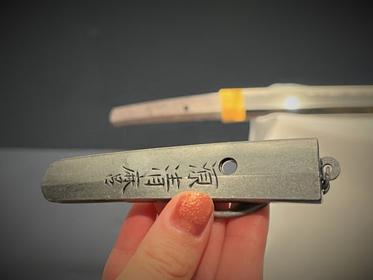 水心子正秀・大慶直胤・源清麿の名が刻まれた茎を忠実に再現したキーホルダー。茎の形状や目釘穴、裏側の年紀に至るまで本物そっくりにこだわって制作しました。金属製のキーホルダーとなっており、本物の日本刀のような重厚感も。ひとたび身につければ、まるで刀を差しているかのような、江戸三作の強い信念に背中を押してもらえる唯一無二のキーホルダーです。