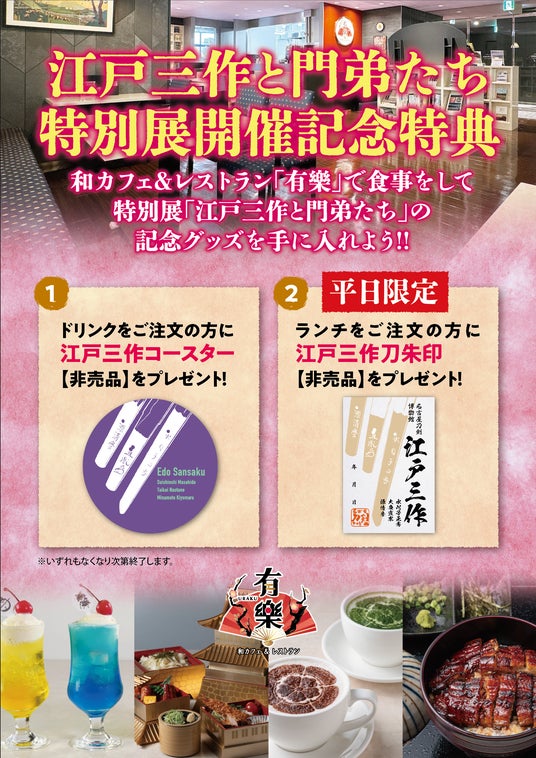 当館に併設している和カフェ&レストラン有樂では、ドリンクをご注文の方に非売品のコースターをプレゼント。さらに、平日限定でランチをご注文の方に、ミュージアムショップでは販売していない特別仕様の刀朱印をプレゼントします。特別展「江戸三作と門弟たち」をご鑑賞の際に、ぜひお立ち寄りください。