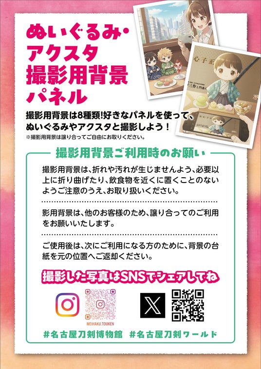 さらに、和カフェ&レストラン有樂にぬいやアクスタと撮影できる、撮影パネルを期間限定で設置中です!全8種類の背景の中から好きな背景を選んで、大切なアクスタやぬいとも撮影してくださいね。