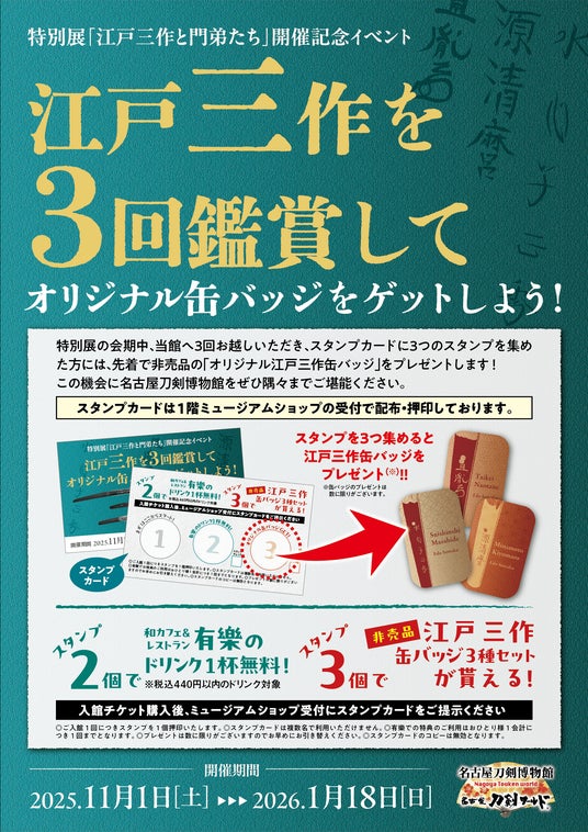 名古屋刀剣博物館「名古屋刀剣ワールド」(愛知県名古屋市、以下当館)では、2026年1月18日(日)まで、特別展「江戸三作と門弟たち」を開催しています。本展に合わせ、オリジナルのミュージアムグッズやイベントを開催。水心子正秀・大慶直胤・源清麿とその門弟たちによる刀の鑑賞とともに、グッズやイベントでも江戸三作の世界をお楽しみください。