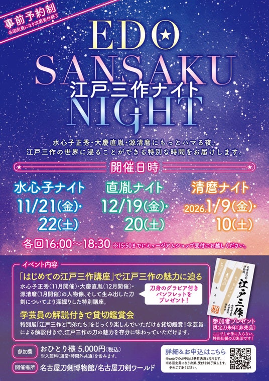 江戸三作について深く学べる講座を聴き、特別展「江戸三作と門弟たち」を貸切で鑑賞ができるイベントを開催。ご参加された方限定で、刀朱印や刀身グラビア付のパンフレットもプレゼント。江戸三作の世界に浸ることができる特別な夜をお届けします。