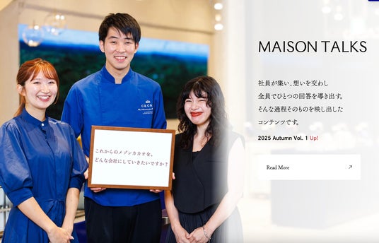 鎌倉発祥のアロマ生チョコレートブランド「メゾンカカオ」(創業者:石原紳伍)はこのたび、採用ページを全面リニューアルしました。今回のリニューアルでは、ブランドのこれからを語る初となる創業者インタビュー、社員同士が未来のメゾンカカオを語り合う新企画「MAISON TALKS」、そして数字からブランドを紐解く「数字で見るメゾンカカオ」を新たに公開します。