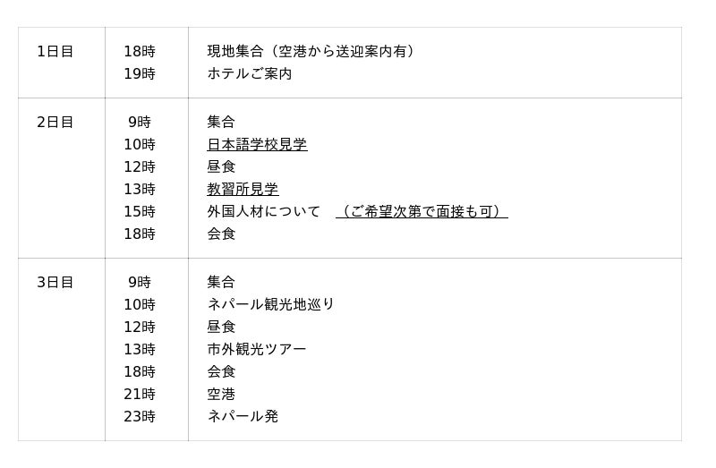 期間は1月の21日(水)~23日(金)にかけて行い、内容としてはアズスタッフが現地で手掛ける教育事業で提携をする日本語学校や教習所の見学、実際の教育現場の視察、希望があればその場で現地面接、候補者のマイクロバスでの運転横乗りなどを行うことが可能となる。また、最終日にはネパールの観光案内なども行っている。