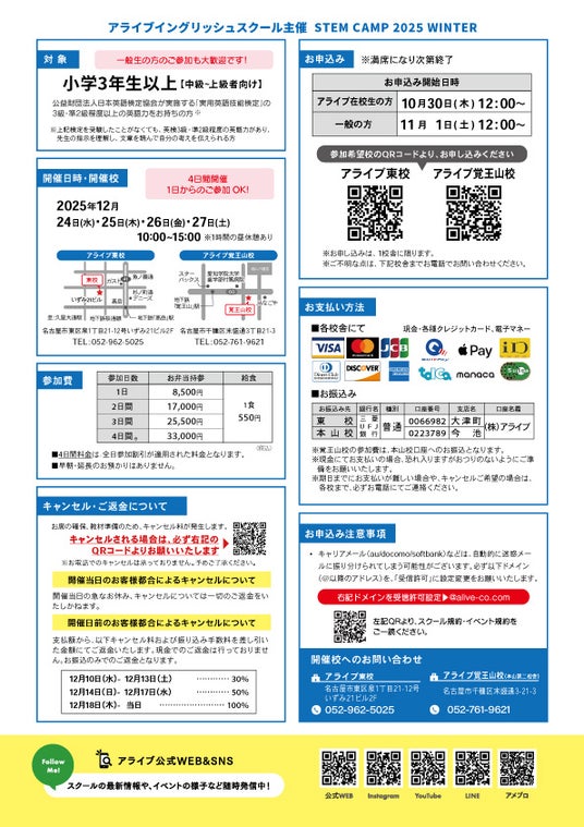 株式会社アライブ(本社:愛知県名古屋市、代表取締役:三井博美)は、2025年12月24日(水)から 12月27日(土)までの4日間、小学3年生~6年生を対象とした英語のSTEAM プログラム「The STEAM of Music ~英語で音を科学する~」を開催いたします。アライブの在籍生に限定されず、どなたでも参加が可能です。