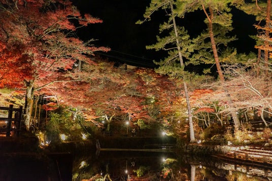 渓流沿いに広がる紅葉が鮮やかに色づき、夜はライトアップによって幻想的な世界へと変わります。