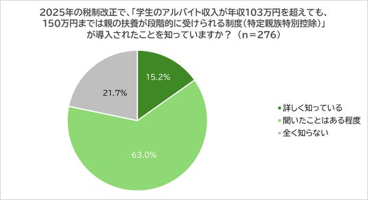 次に、「2025年の税制改正『特定親族特別控除』を知っているか?」を尋ねたところ、「詳しく知っている」は15.2%、「聞いたことはある程度」が63.0%と、約8割(78.2%)が認識していることがわかりました。