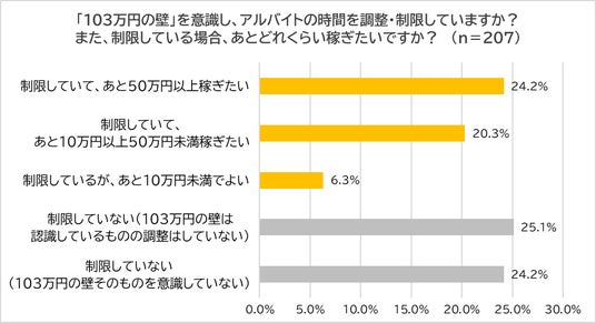 今度は、19歳以上23歳未満のアルバイトをしている学生に「『103万円の壁』を意識し、アルバイトの時間を調整・制限しているか?また、あとどのくらい稼ぎたいか?」と尋ねたところ、半数(50.8%)の学生が「壁を意識して収入を制限」しており、24.2%が「あと50万円以上稼ぎたい」と答えました。