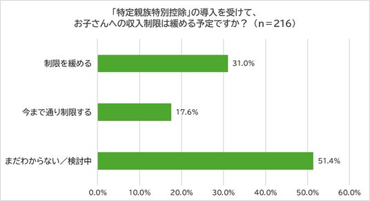 続いて、認識していると回答した親に「『特定親族特別控除』の導入を受けて、子供の収入制限を緩める予定か?」と尋ねたところ、「制限を緩める」は31.0%にとどまり、半数以上(51.4%)が「まだわからない/検討中」と回答しました。