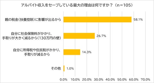 壁を意識して収入を制限していると答えた学生に「アルバイト収入をセーブしている最大の理由」を尋ねたところ、最も多かったのは「親の税金(扶養控除)に影響が出るから」(58.1%)でした。次いで「自分に社会保険料がかかり、手取りが大きく減るから(130万円の壁)」(26.7%)、「自分に所得税や住民税がかかり、手取りが減るから」(14.3%)と続きました。これにより、学生の多くが自分のためではなく、親の税負担を気にして制限していることが明らかになりました。