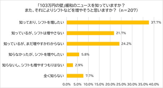 最後に、「『103万円の壁』緩和のニュースを知っているか?また、それにより働き方に変化はあるか?」尋ねました。37.7%が税制改正を「知っており、シフトを増やしたい」と回答し、「知らなかったが、増やしたい」(5.8%)も含めると、4割超(43.5%)の学生が働いて収入を増やしたいと思っていることがわかりました。