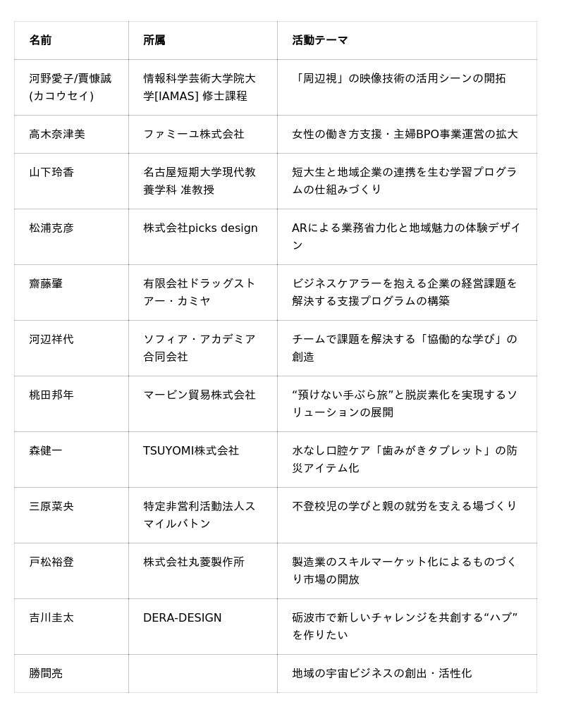このたび、本プログラムの「アジェンダオーナー」(採択者)を決定しましたので、お知らせいたします。本プログラムでは今後、アジェンダオーナーに対し、2026年2月までの期間でメンタリングによる伴走支援を行うほか、「共創イベント」の登壇によるパートナーや支援者とのマッチング、中部地域での先進事例視察などの各種支援メニューを提供します。