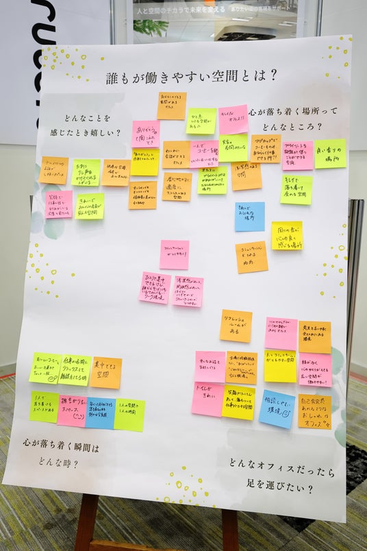 また「誰もが働きやすい空間とは?」というテーマで自由に記載してもらうワークでは、「集中できるスペースがある」「川のせせらぎなど自然音が聞こえる」「トイレが綺麗」「声をかけてもらえる」など、空間や音への配慮、コミュニケーションの重要性を感じさせる内容が多く寄せられました。