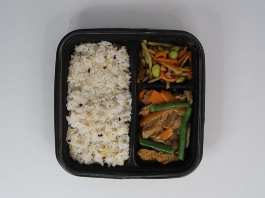 KaRuNa LUNCH BOX ソイミートのソテー弁当(Sauteed Soy meat and Vegetables)「大豆まるごとミートフィレタイプ」を香ばしい胡麻油でソテーし、まいたけや人参、ごぼう、さやいんげん、枝豆などの野菜と合わせました。