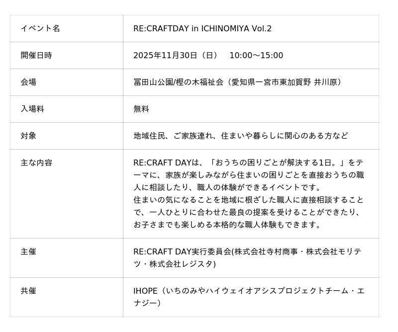 RE:CRAFT DAYとは「おうちの困りごとが解決する1日」をコンセプトとして、一宮市とその周辺に暮らす住民が地域の職人と本格的なお仕事の体験やおうちの困りごとの相談などを通して、直接つながり、適正な価格で良質なサービスを受けられる場です。