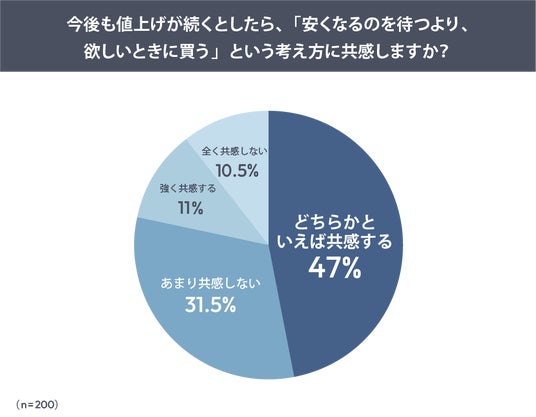 「今後も値上げが続くとしたら、“安くなるのを待つより欲しいときに買う”という考え方に共感しますか?」という質問では、「強く共感する」(11%)、「どちらかといえば共感する」(47%)を合わせて約6割が共感。