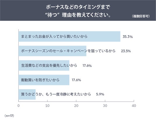「まとまったお金が入ってから買いたい」(35.3%)、「セール・キャンペーンを狙っている」(23.5%)、「衝動買いを防ぎたい」(17.6%)などが挙げられました。