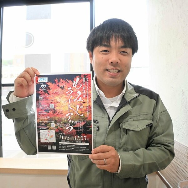 紅葉シーズンに合わせ、岐阜県揖斐郡揖斐川町谷汲で今月開かれる二つの「もみじまつり」をPRするキャラバンが、岐阜新聞本社を訪れ、来場を呼びかけた。