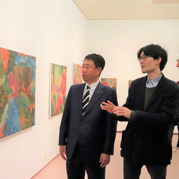 大垣市の洋画家矢橋頌太郎さん(37)の個展「花園」が12日、岐阜市大宮町の加藤栄三・東一記念美術館で始まった。人の頭頂部を花に見立て、人々の関係性や現代社会のありようを表現した15点を展覧する。12月21日まで。