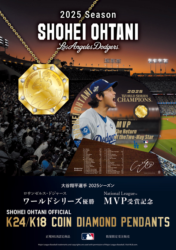 ロサンゼルス・ドジャース ワールドシリーズ優勝、ナショナル・リーグ MVP受賞記念 SHOHEI OHTANI OFFICIAL K24/K18 COIN DIAMOND PENDANTS 11月21日(金) 午前11時より、IMAYO 公式オンラインショップ 他 にて受注発売