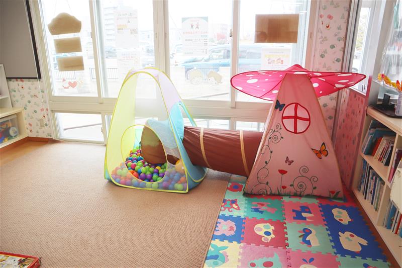食事の後はこどもコーナーで遊びます。「ミニミニ図書館」もあります。