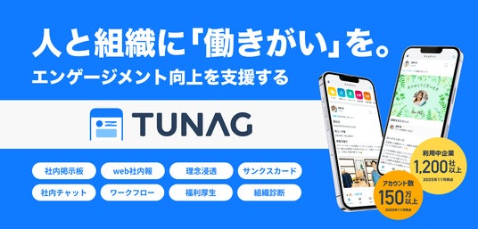 TUNAG(ツナグ)は、組織の生産性向上や離職率の低下を目的とし、社内コミュニケーションと情報共有を促進する統合型プラットフォームです。2025年8月時点で、利用中企業数は1,200社、利用ユーザー数は150万人を突破しています。