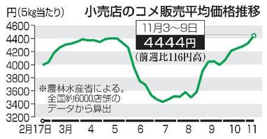 農林水産省は14日、全国の小売店約6千店で3〜9日に販売されたコメ5キロの平均価格が前週に比べて116円高い4444円だったと発表した。集計を開始した2月以降で最も高くなり、随意契約で備蓄米を放出する前に記録した水準を超えた。価格上昇は6週連続。