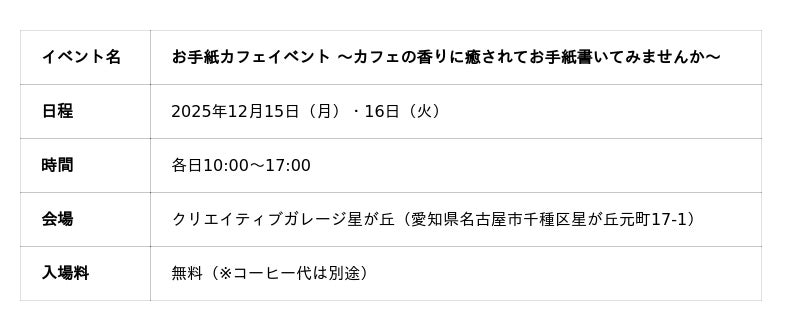 スマホやSNSでは伝えきれない想いを、手書きの文字で大切な誰かへ届ける。そんな体験ができる郵便局主催のイベント『お手紙カフェイベント』が、2025年12月15日(月)・16日(火)の2日間限定で、名古屋・星が丘 クリエイティブガレージ星が丘にて開催されます。