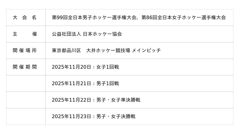 周辺案内地図の掲出など、公共性の高い事業を展開する表示灯株式会社(本店:愛知県名古屋市 代表取締役社長:徳毛孝裕、以下「当社」)は、2025年11月20日~23日の期間にて開催される『第99回男子、第86回女子全日本ホッケー選手権大会(主催:公益社団法人日本ホッケー協会)』において、大会オフィシャルスポンサー契約を締結したことをお知らせいたします。