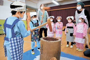 育てたもち米、ペッタン 高山の美鳩幼稚園児が餅つき