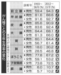 がん5年生存率膵臓10% 12~15年診断 90年代比、多くが向上 ぼうこう、子宮頸がんは低下