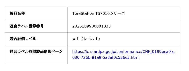 株式会社バッファロー(本社:東京都千代田区、代表取締役 社長執行役員CEO:牧 寛之)は、法人向けNAS TeraStation TS7010シリーズが、経済産業省の主導のもと独立行政法人情報処理推進機構(IPA)が運用するセキュリティ要件適合評価及びラベリング制度「JC-STAR」に適合したことを発表いたします。適合には最新のファームウェアを適用していただく必要がございます。
