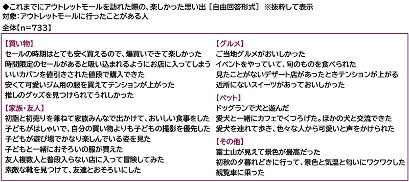 アウトレットモールに行ったことがある人(733名)に、これまでにアウトレットモールを訪れた際の、楽しかった思い出を聞いたところ、買い物関連では「時間限定のセールがあると吸い込まれるようにお店に入ってしまう」、「いいカバンを値引きされた値段で購入できた」、家族・友人関連では「子どもが遊び場でかなり楽しんでいる姿を見た」「素敵な靴を見つけて、友達とおそろいにした」、グルメ関連では「イベントをやっていて、旬のものを食べられた」「見たことがないデザート店があったときテンションが上がる」、ペット関連では「愛犬と一緒にカフェでくつろげた。ほかの犬と交流できた」「愛犬を連れて歩き、色々な人から可愛いと声をかけられた」、その他では「初秋の夕暮れどきに行って、景色と気温と匂いにワクワクした」、「観覧車に乗った」といった回答が挙げられました。