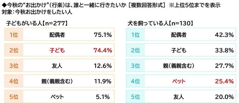 子どもがいる人(277名)の回答をみると、「配偶者」(75.1%)と「子ども」(74.4%)が7割半となり、「友人」(12.6%)、「親(義親含む)」(11.9%)、「ペット」(5.1%)が続きました。今秋お出かけを計画しているパパ・ママの大半が、子連れでのお出かけを希望していることがわかりました。