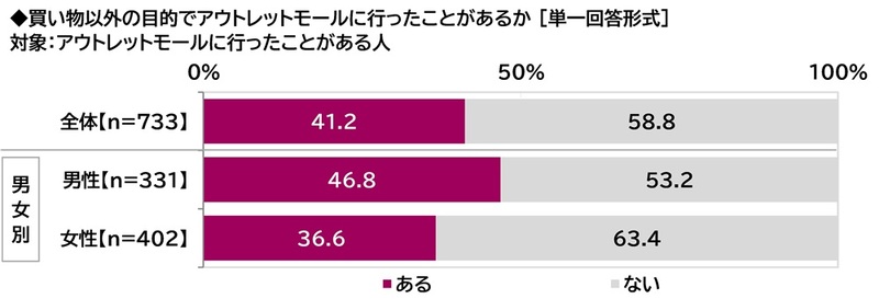アウトレットモールに行ったことがある人(733名)に、買い物以外の目的でアウトレットモールに行ったことがあるか聞いたところ、「ある」は41.2%、「ない」は58.8%でした。