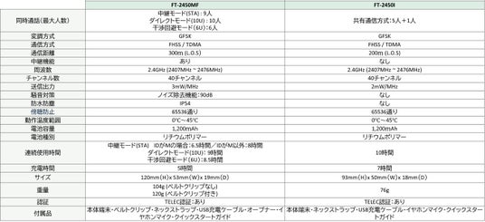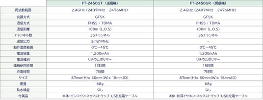 FT-2450GT(ガイドフォン送信機)/FT-2450I(ガイドフォン受信機)の主な仕様