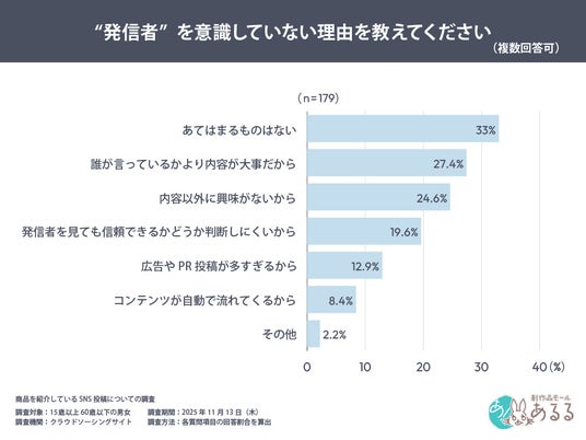 さらに59%が「発信者を意識していない」と答えるなど、生活者は“誰が発信しているか”よりも “投稿の内容そのもの” を基準に判断している実態が浮き彫りになりました。