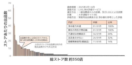 「安全性」「おいしさ」の2つの観点が評価され、選ばれている浄水栓ですが、国内の大手通販サイトで多くの模倣品・互換品が出品されています。数の多い上位63ストアが販売するLIXIL用互換品を対象に性能調査を実施したところ、調査した全ての製品(81製品中81製品)がLIXILの定める浄水能力を満たしておらず、そのうち11製品はLIXILの商標を無断で使用した「模倣品」と判明いたしました。