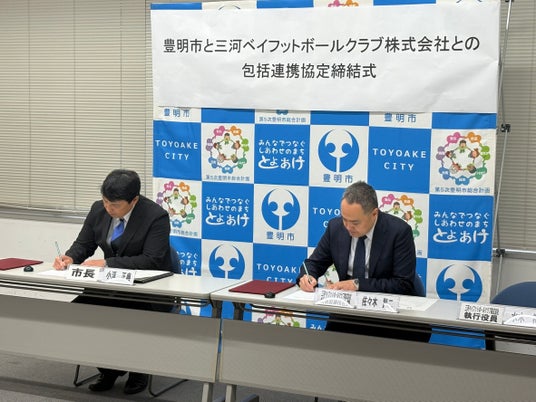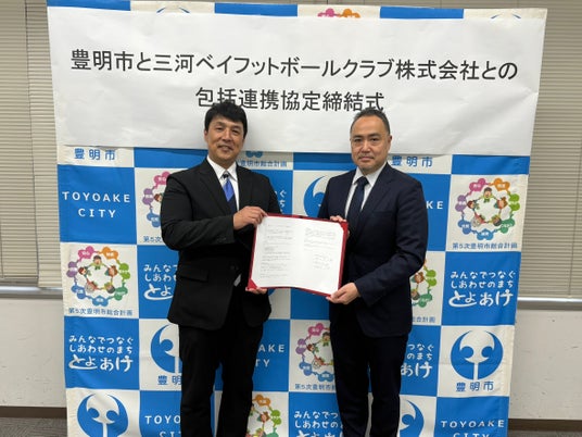 この度、三河ベイフットボールクラブ株式会社は11月18日(火)に行われた包括連携協定式にて『豊明市』と包括連携協定(ホームタウンパートナー協定)を締結をいたしましたのでお知らせいたします。