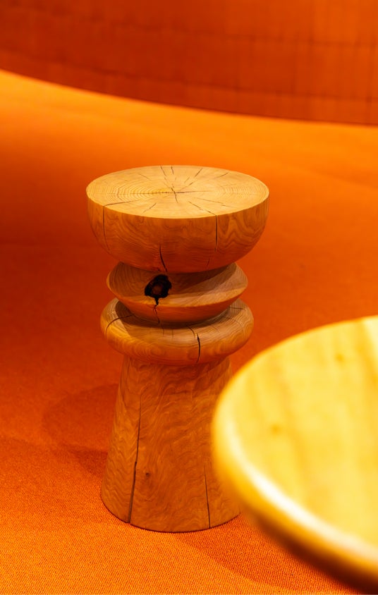 あたたかな空間との相性が良い木製スツールは、茨城県に工房を構える「STUDIO ROUTE 408」のスギタユウスケ氏によるもの。Et下北沢フラッグシップカフェでも導入されているロースツールの他、今回新たにテーブルやハイスツールなど、さまざまな形状から生み出される木目の表情が空間に息を吹き込みます。