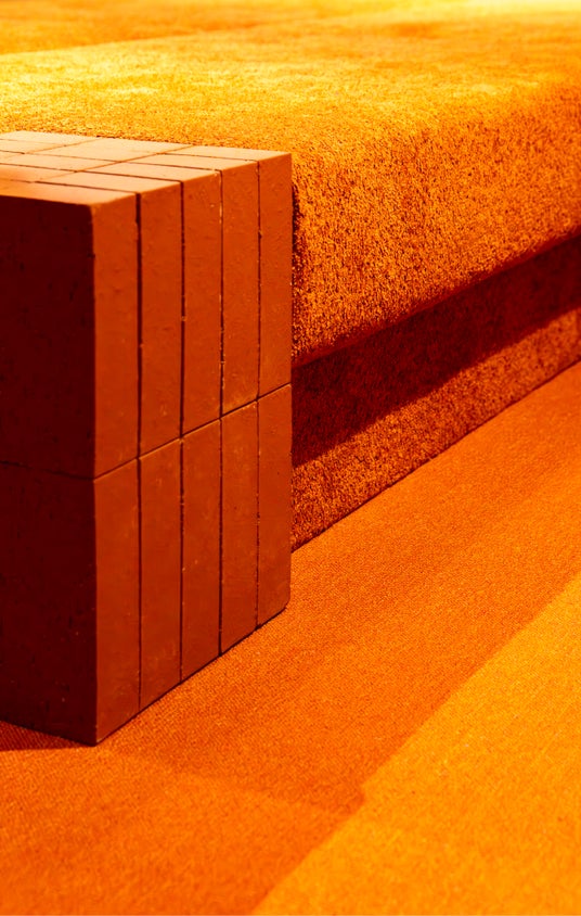 愛知県常滑市で採掘される良質な赤土からインスピレーションを受け、円形のメインカウンターや、座席の背面等に赤土のレンガをふんだんに使用。素朴な風合いであたたかな印象の赤土の質感を引き立たせるため、カフェでは珍しい全面カーペット敷きを取り入れ、同じくワントーンで合わせることで、店舗に足を踏み入れた瞬間にPhiの世界観へ没入するかのような、全体的に包み込まれる落ち着きある空間に仕上げました。