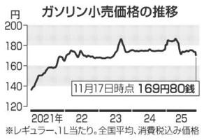 ガソリン170円割れ 全国2年半ぶり水準 補助金増額 岐阜は前週比4円超安