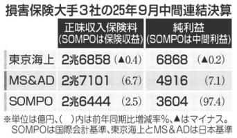 損保大手、2社増益 9月中間 自然災害少なく