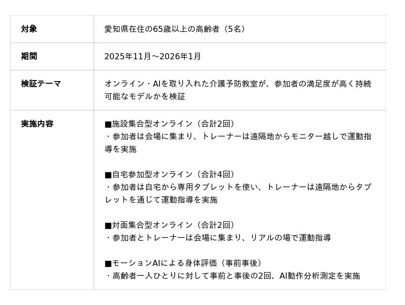 本実証実験は、65歳以上の高齢者5名を対象に、遠隔地のトレーナーとモニター越しにコミュニケーションを取りながら実施するオンライン体操と、参加者の動作データをAIで解析して身体評価を行うツールを活用し、最適な運動プログラムを提供するものです。