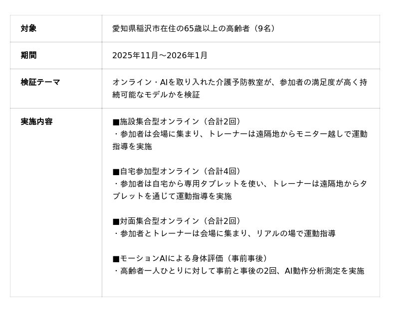 本実証実験は、65歳以上の高齢者9名を対象に、遠隔地のトレーナーとモニター越しにコミュニケーションを取りながら実施するオンライン体操と、参加者の動作データをAIで解析して身体評価を行うツールを活用し、最適な運動プログラムを提供するものです。