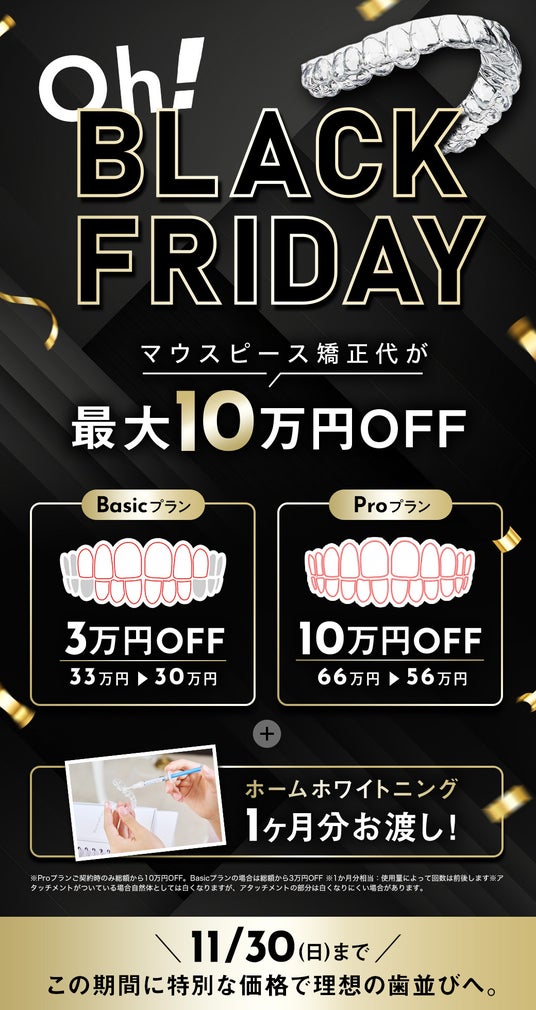 Oh my teethは11/30(日)23:59ご予約まで、期間限定のマウスピース矯正キャンペーン「Oh! Black Friday」を開催中です。キャンペーン対象のプランは、Basic(部分矯正)・Pro(広範囲矯正)の2種類。「Oh! Black Friday」を利用すると、Basicは通常33万円から3万円OFFの30万円、Proは通常66万円から10万円OFFの56万円でマウスピース矯正を始められます。