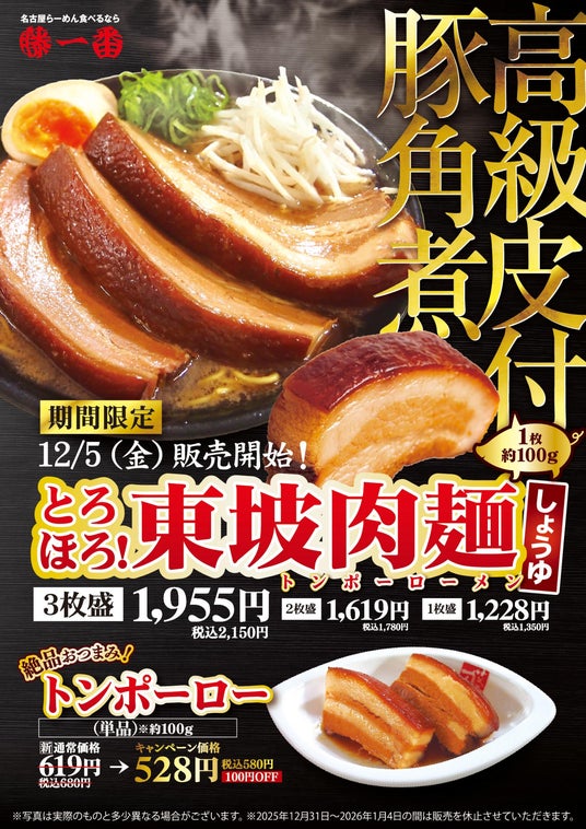 名古屋らーめん「藤一番」( http://www.fujiichiban.jp )は、2025年度季節ごとに販売し、話題を呼んでいる「とろほろ!東坡肉麺」の第3回目の販売を2025年12月5日(金)よりスタートします。