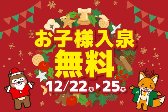 クリスマスを含む12月22日(月)から25日(木)までの期間中、小学校6年生までのお子様入泉者を対象に、入泉料を無料とさせていただきます。冬休みが始まったばかりのこの時期に、ぜひご家族皆様で湯の城へお越しいただき、温かい温泉で楽しい思い出をお作りください。