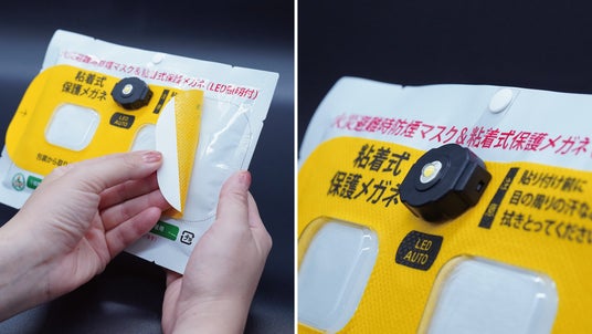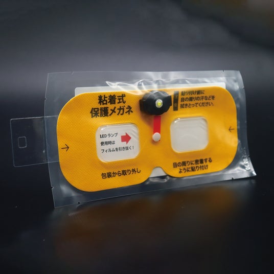 包装から剥がして使用する粘着式保護メガネ。剥がす際に絶縁テープが抜けると、LEDライトが点灯。